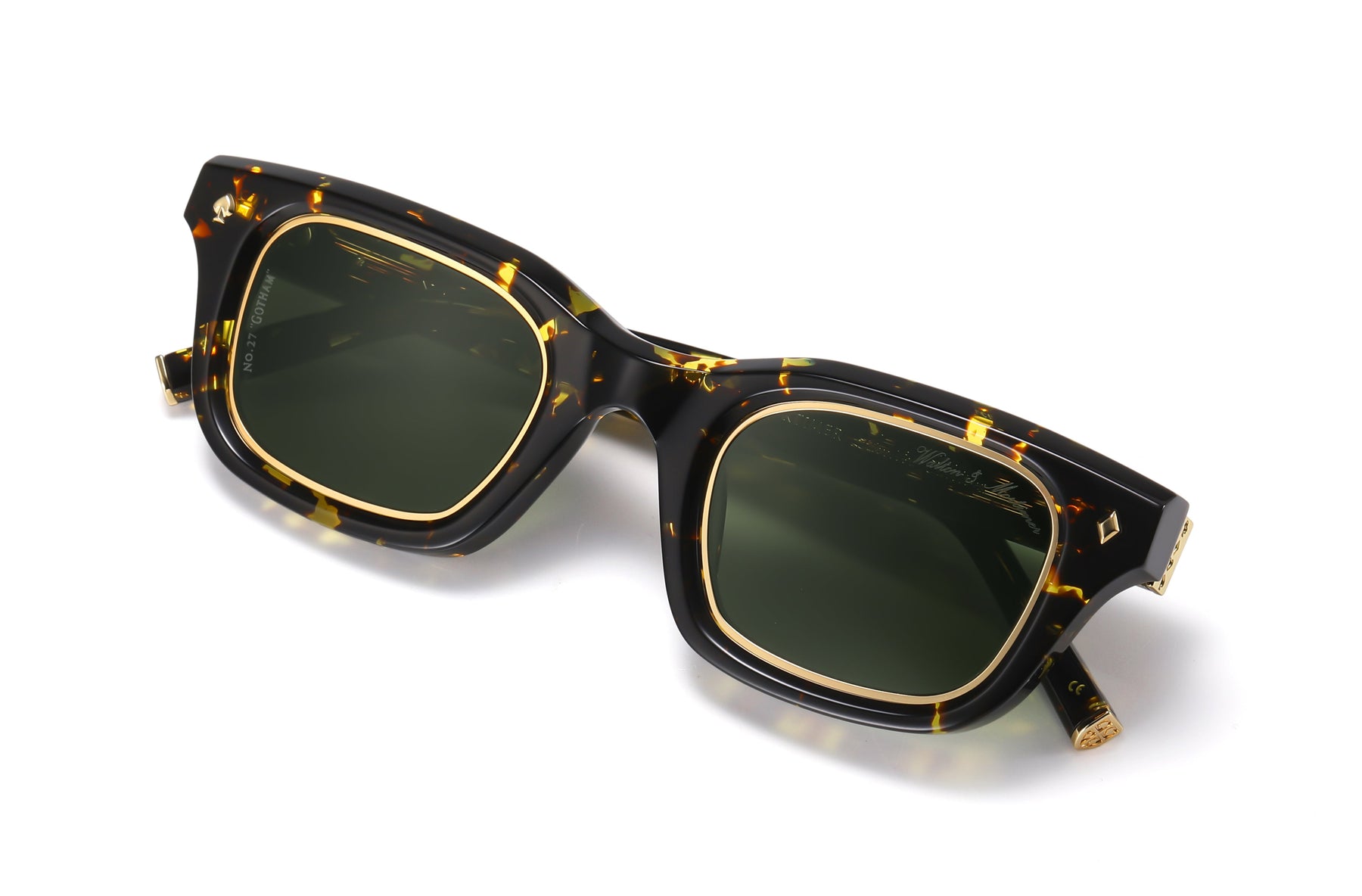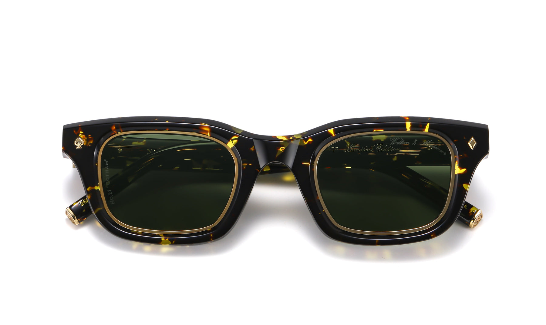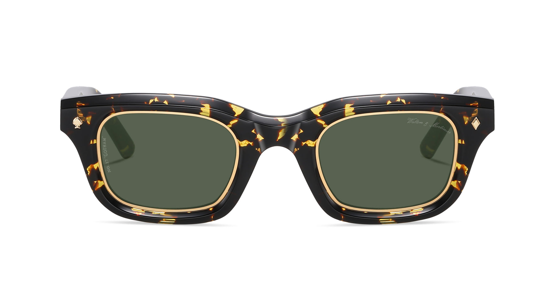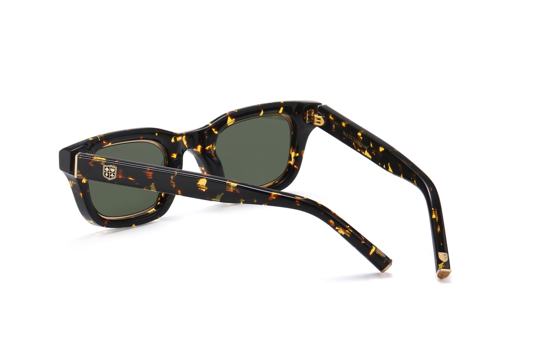 De No.27 “Gotham” zonnebril behoort tot de exclusieve Runway Collection en is een toonbeeld van luxe en vakmanschap. Dit model is handgemaakt van 8 mm dik Italiaans Mazzucchelli-acetaat in de kleur Havana Rum (tortoise), gecombineerd met premium groene Carl Zeiss lenzen en verfijnde 24K gouden details.