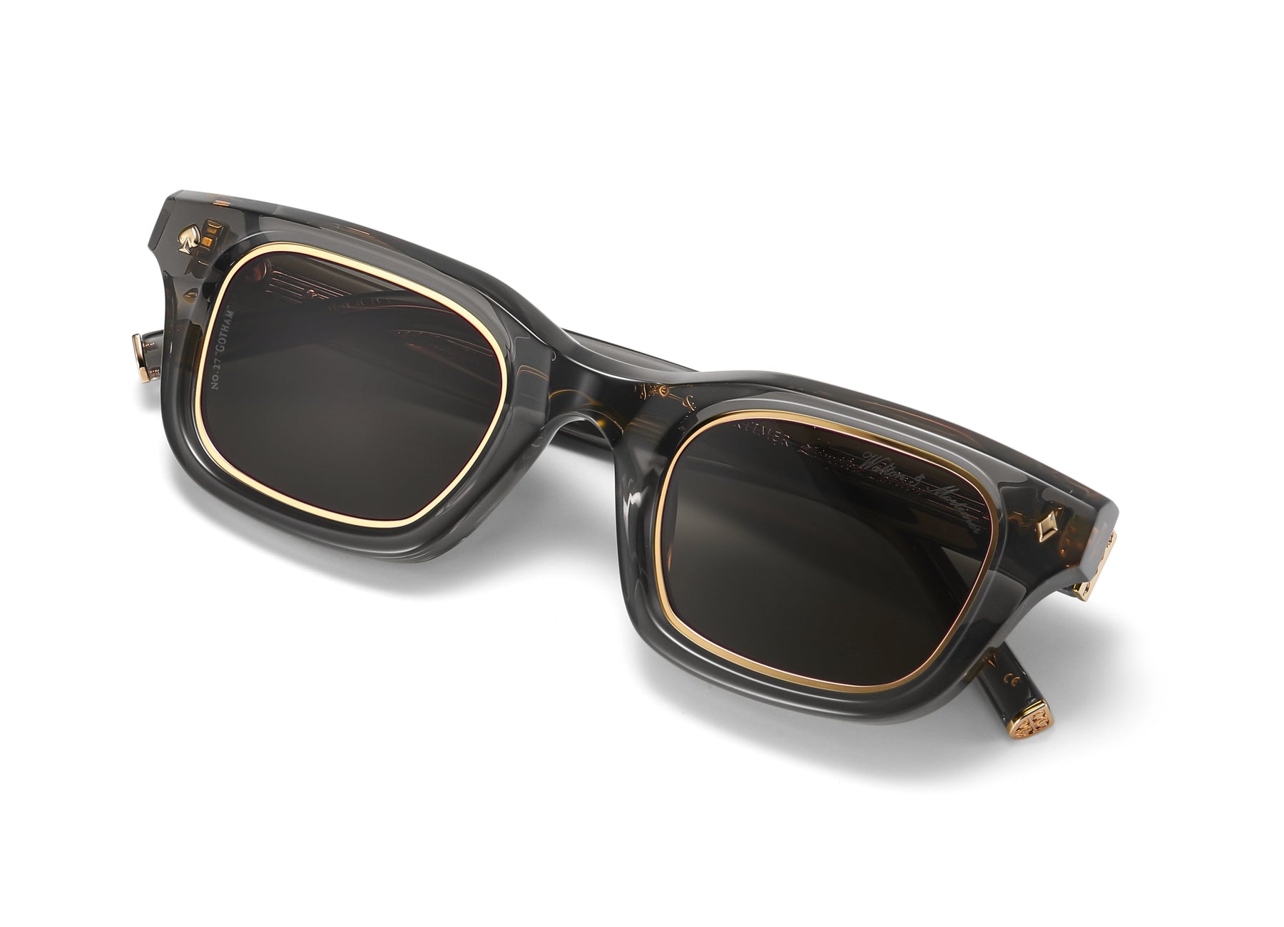 De No.27 “Gotham” zonnebril uit de exclusieve Runway Collection staat voor luxe en verfijning. Dit model is handgemaakt van 8 mm dik Italiaans Mazzucchelli-acetaat in de kleur Stormy Gray (transparant grijs) en uitgerust met premium grijze Carl Zeiss lenzen. Subtiele 24K gouden details maken het ontwerp compleet.