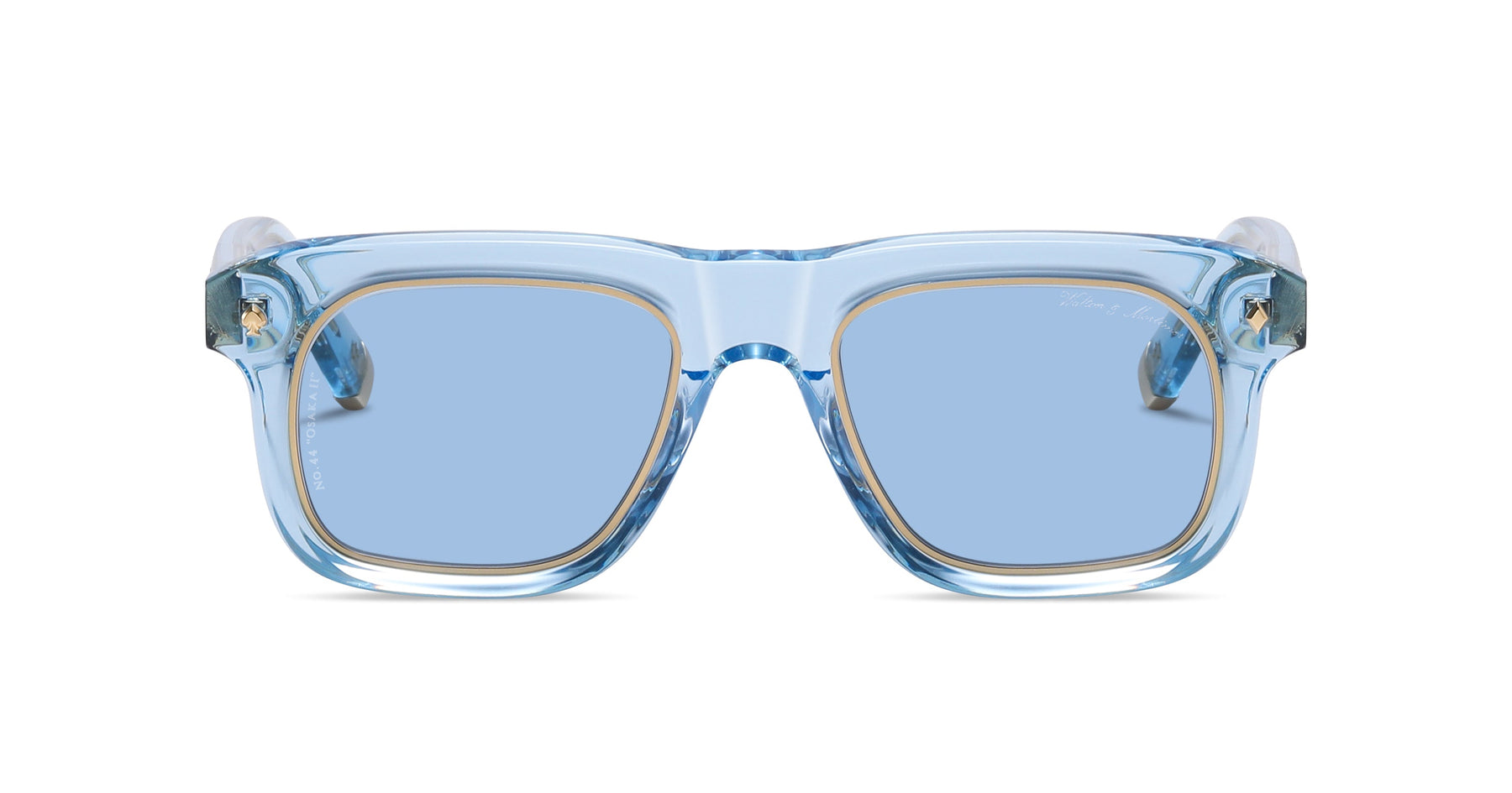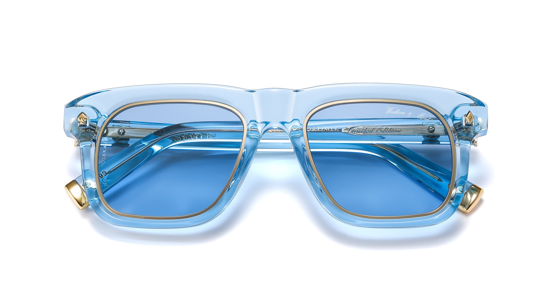 De No.44 “Osaka II” is de opvolger van het iconische Osaka-model en onderdeel van de exclusieve Runway Collection. Deze luxe zonnebril is handgemaakt van 8 mm dik Italiaans Mazzucchelli-acetaat in de kleur Côte d’Azur Blue (transparant blauw), voorzien van premium blauwe Carl Zeiss lenzen en verfijnde 24K gouden details.